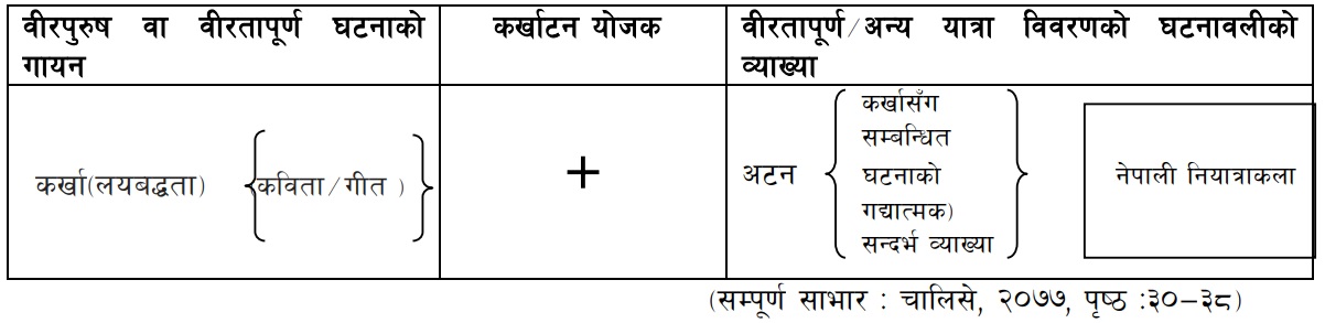 सर्जकद्वारा विभिन्न महान पुरुषहरूको जीवनी एवं तिनका आदर्शका बारेमा विषयवस्तु बनाई निबन्धात्मक शैलीका माध्यमबाट नियात्रा विवरण समेतको प्रस्तुतीको नयाँ ढाँचामा वर्णनका पद्धतिद्वारा तयार गरिने साहित्यिक संरचनालाई वर्णनात्मक गाथाको रूपमा प्रयोग गरिन्छ । कर्खा र यात्राको कलेवरमा वर्णनात्मक गाथाको विषयवस्तु, शैलीगत प्रयोग विधि, घटनाहरूको संयोजनका माध्यमबाट घटना विवरणको प्रस्तुतीको सन्दर्भअनुसार कविता वा गीतहरूको प्रस्तुती समेत गरी नियात्रा साहित्यको सिर्जना गरिने कार्यका लागि यसको प्रयोग समेत गरिन्छ । यस्तै प्रयोग जापानी साहित्यमा “हाइकु” मिश्रित गरी लेखिएको “गद्यात्मक यात्राकथा” लाई “हाइबुन” भनिएको पाइन्छ । हाइबुनलाई गद्य विधाको रूपमा जापानी साहित्यमा मानिएको भए तापनि यसमा “हाइकु (कविता)” एवं “गद्य(निबन्धात्मक वर्णन)” दुवै शैलीहरूलाई समावेश गरेर लेखिन्छ । ठीक यस्तै महान पुरुषहरूको साहसीपूर्ण कार्यलाई नियात्रा साहित्यमा तिनका साहसपूर्ण वा वीरतापूर्ण घटनालाई “कविता÷गीत” एवं “गद्य(निबन्धात्मक वर्णन)” आदि प्रयोग गर्ने नियात्राको प्रायोगिक शैलीलाई कर्खाटनको रूपमा लिइएको छ । त्यसै गरी “हाइबुन” एक छोटो गद्य र हाइकुको संयोजन भएकोले यसलाई एक यात्रा कथाको रूपमा लेखिएको पाइन्छ । सन्त एवं हाइकु कवि माचुओ बासोे यस लेखन शैलीका प्रबर्तकका रूपमा मानिन्छन् । तथापि नेपाली साहित्यको लोक परम्परामा आधारित कर्खा गायनको यात्रा पनि उस्तै प्रकारको देखिन्छ भने कर्खालाई गाउने मात्रै हैन, कथ्ने, वर्णन गर्ने, बिचबिचमा गद्यका संरचनाहरूले जोड्ने काम गरिएको समेत पाइन्छ । यस्तै वर्णनात्मक संरचना कर्खाटनको नवीन शैलीको रुपमा प्रयोग समेत हुनसक्दछ ।